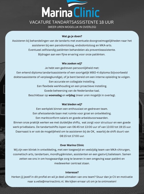 Marina Clinic is een zelfstandige kliniek gespecialiseerd in mond-, kaak- en aangezichtschirurgie, tandheelkunde en cosmetische behandelingen, waaronder injectables zoals Botox en fillers. Wij combineren medisch-specialistische zorg met persoonlijke aandacht in een moderne en toegankelijke setting. Onze zorgprofessionals werken volgens de hoogste kwaliteitsnormen en hechten veel waarde aan patiëntveiligheid en continue verbetering. Wij bieden hoogwaardige zorg op een gastvrije en efficiënte manier.